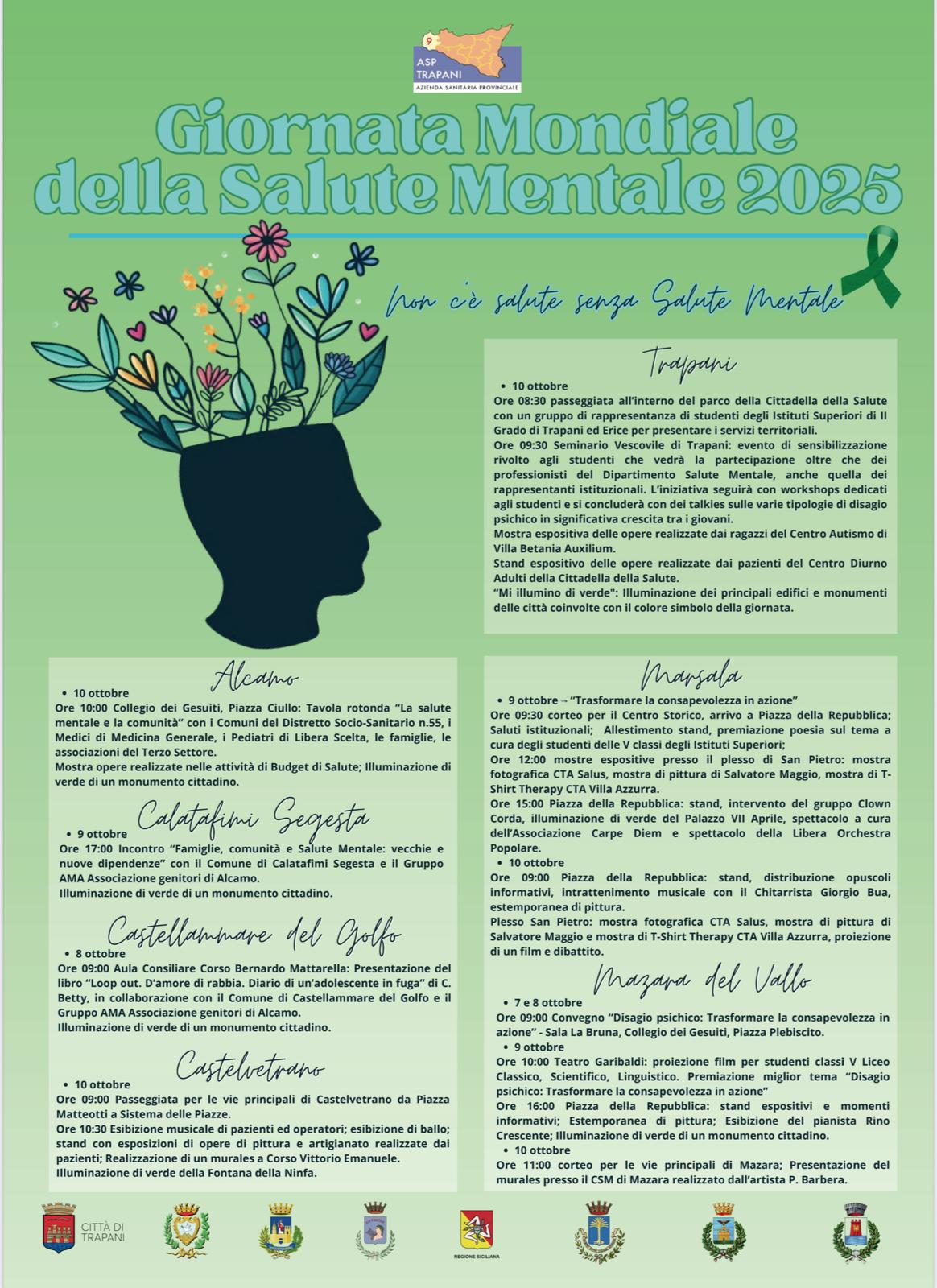 Anche a Castelvetrano il prossimo 10 ottobre 2025, si terranno diverse attività in occasione della giornata mondiale dedicata alla salute mentale. L’ASP di Trapani ha previsto un nutrito programma di appuntamenti in varie città della Provincia. In particolare, a Castelvetrano, il Centro della Salute Mentale ha predisposto una serie di eventi che inizieranno con una passeggiata simbolica e con una serie di spettacoli che si terranno nel Sistema delle Piazze.